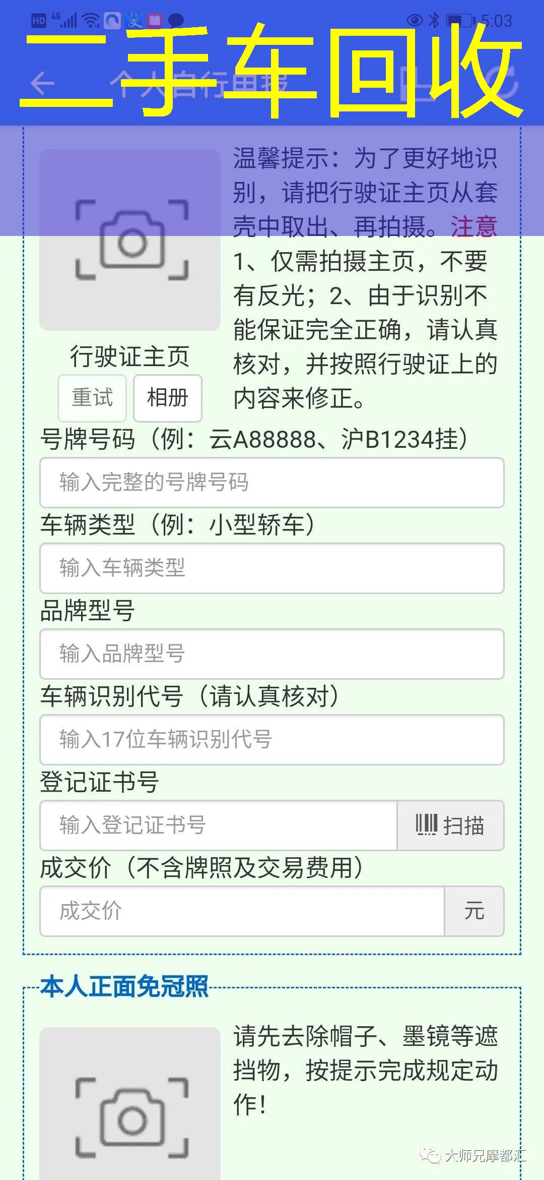 提前上传个人交易信息可以提高过户效率,可以使手拉手交易更便捷,希望车友踊跃下载APP软件,有任何疑问可扫面大师兄微信二维码咨询:
